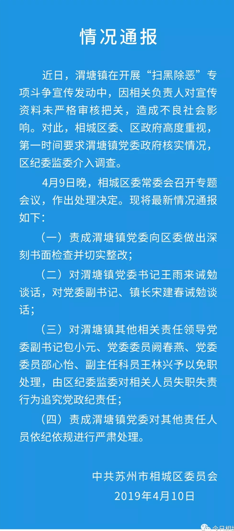 今日(4月10日),相城区委区政府官方微信“今日相城”发布情况通报称,近日,渭塘镇在开展“扫黑除恶”专项斗争宣传发动中,因相关负责人对宣传资料未严格审核把关,造成不良社会影响。对此,相城区委、区政府第一时间要求渭塘镇党委政府核实情况,区纪委监委介入调查。