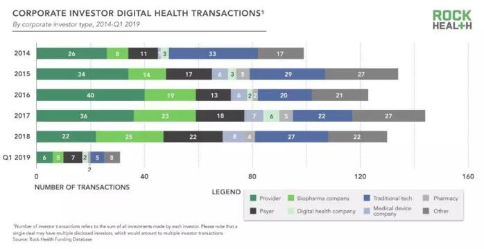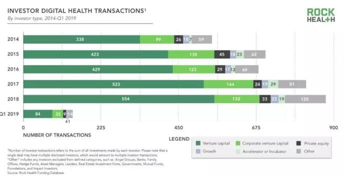近年来,数字健康领域的火热吸引了大批投资者,其中不乏着名的风险投资公司Andreessen Horowitz 、 Khosla Ventures 、 New Enterprise Associates 、 Y Combinator 等,耳熟能详的科技巨头,谷歌、IBM、苹果等,以及深耕医疗领域投资的诺华、默克和 GV 。这些公司近年来始终关注数字健康领域的发展,寻找合适的标的,2019年第一季度投融事件中也有他们的身影。