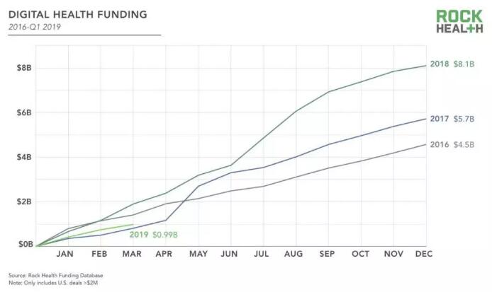 除去2018年年中数字健康领域涌入的大笔投资金额外,过去两年(2017年第一季度-2019年第一季度)的平均季度资金为14亿美元,这意味着2019年Q1季度9.86亿美元的投资略低于平均趋势。