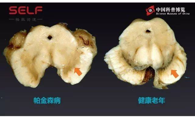 在你面前的是帕金森患者和健康的老年人他们的中脑切片对比,你的右边是健康老年人的中脑,你看到箭头所指的部分黑色非常深,这就是中脑的黑质神经元,它之所以叫黑质也是因为这个原因;