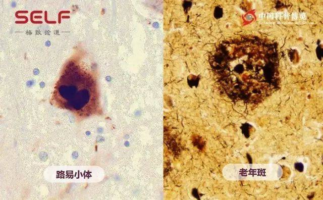 如果我们看显微镜下那这种区别就更加明显了,左边这个粉红色的圆形的结构是路易小体,他是帕金森病的病理改变,它的主要成分是α突触核蛋白,而你的右边这个黄色的菊花样的结构是老年痴呆症的病理改变,它叫老年斑,它的主要成分是β淀粉样蛋白。