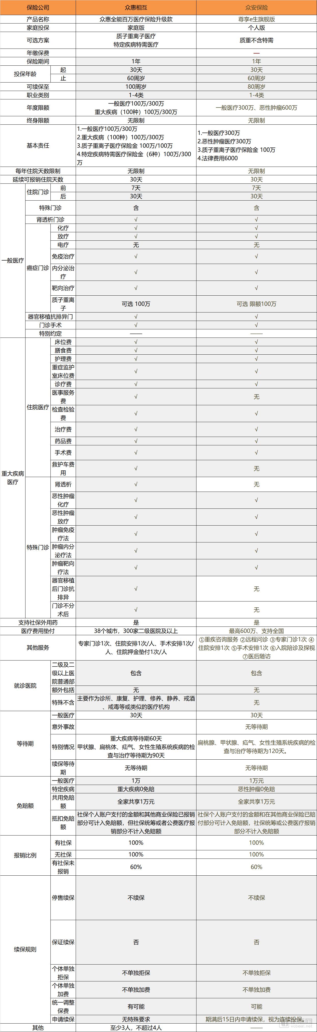 医疗险是众安保险“尊享e生旗舰版”、众惠相互“全能百万医疗保险升级款”;