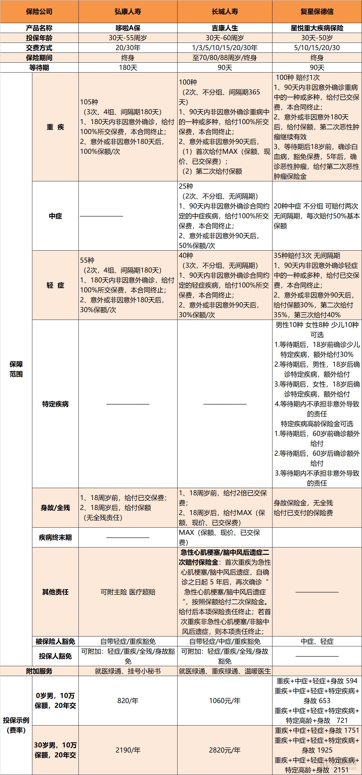 重疾险又分为多次赔付和单次赔付两类,前者代表性产品包括弘康人寿“哆啦a保”、华夏人寿“常春藤”、百年人寿“康惠保多倍版”,后者代表性产品为百年人寿“康惠保”旗舰版、复星保德信“星悦重大疾病保险”;