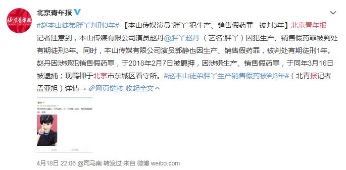 4月18日晚间,北京青年报官方微博发布了一则《本山传媒演员“胖丫”犯生产、销售假药罪被判3年》的消息,引起了关注。