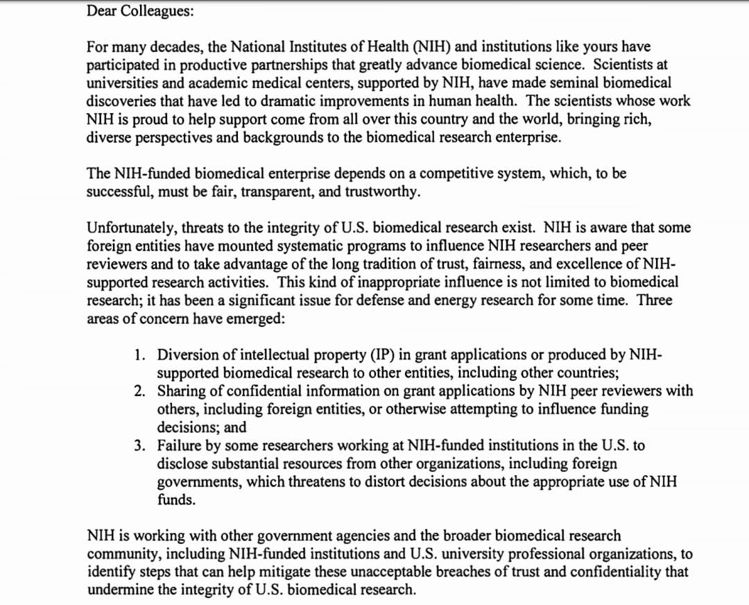 美国 NIH 今年的预算为 390 亿美元,其 80% 分配给了全国各地的研究人员。Francis Collins 给上万家机构发信称,要警惕外国窃取知识产权的“系统性”行动,一些外国政府对美国的研究进行不正当的影响和利用,包括由 NIH 资助的研究。