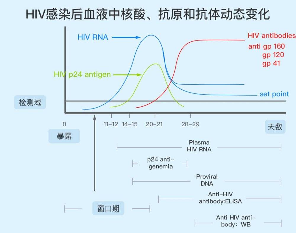 若处于急性感染期,血清中也通常可检出P24(病毒包膜的组成之一),大部分急性期感染者均可通过第四代HIV检测检出。最优的方法是进行核酸定性检测 ,目前最容易获得相对可行度最高的方法是抗原抗体联合试验,也就是所谓的4代检测。