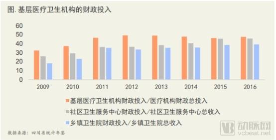 据图表显示,基层医疗卫生机构财政投入/医疗机构财政总投入,从2009年-2012年,其投入占比从32.40%增到49.29%。随后又逐渐降低,2016年降到47.59%。