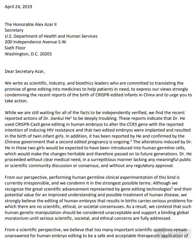 信中写道,虽然他们仍在等待事件进一步核实,但贺建奎的行为让他们感到不安。贺建奎在第26届国际人类基因组编辑大会上展示了他如何利用CRISPR-Cas9对人类胚胎的CCR5基因进行改变,并表示希望借此使两名女婴能够对HIV免疫。根据贺建奎的报告,除了已经出生的两名女婴外,还有一名经过编辑的婴儿未出生。