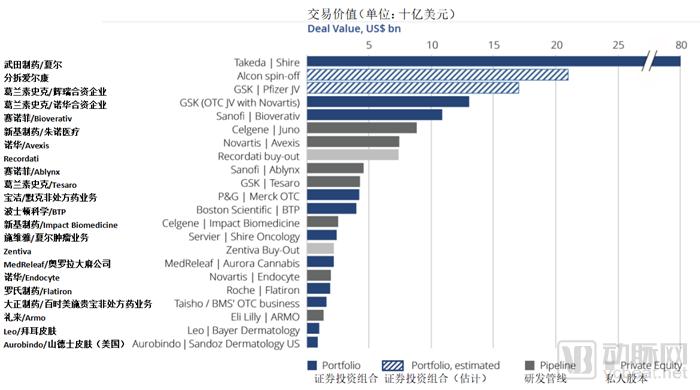 图2:2018年以战略类型划分的交易。证券投资组合——收购或剥离业务平台。研发管线——收购药物开发项目。私人股本——由金融投资者收购。