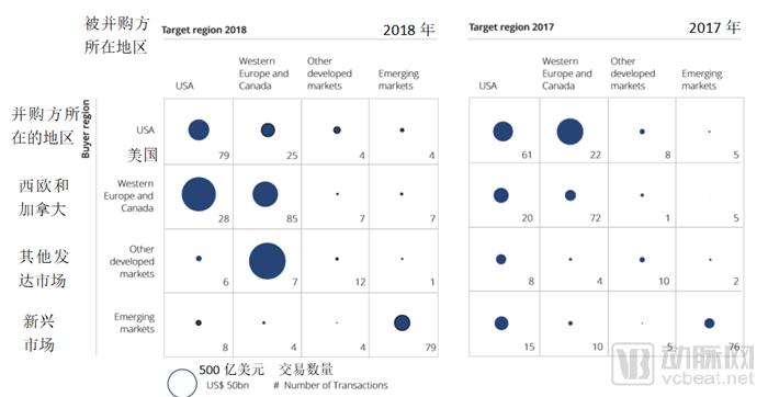 图1:2018年医药行业并购情况。数字表示交易数量,圆圈大小表示已公开或估计的交易总价值。