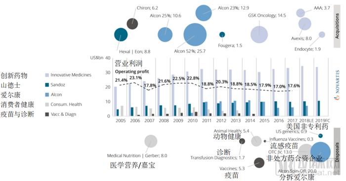 图3:诺华自2005年以来的部分收购(上半部分)和旗下业务处理(下半部分)。圆圈大小与公开的交易金额相对应。中心图反映了诺华的收入(条形图)和营业利润(虚线)(单位:十亿美元)。