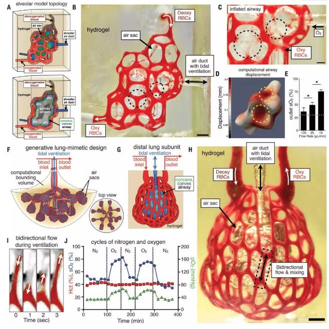 对肺部模拟结构的测试显示,这些组织足够坚固,可以避免在血液流动和脉动”呼吸”过程中破裂。脉动”呼吸”是一种有节奏的吸气和呼气,模拟了人类呼吸的压力和频率。测试发现,当红细胞流经”呼吸”气囊周围的血管网络时,它们可以吸收氧气。这种氧气的运动类似于肺泡囊中的气体交换。