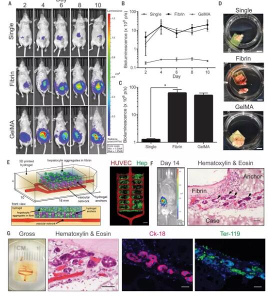 为了验证打印组织的生物兼容性,研究团队将装载了肝细胞的 3D 打印组织植入患有慢性肝损伤的小鼠体内,组织具有用于血管和肝细胞的独立隔室。实验结果显示,肝细胞能够在植入后存活。