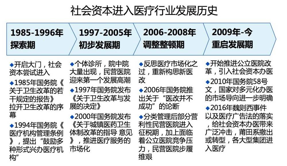 然而社会资本想要成为一股重要医疗服务力量,还有很长的道路要走。当前,民营医院普遍经营困难,吓退了很多社会资本进入医疗的脚步。魏则西事件之后,民营医院连带受到了重创,可信度进一步降低。野路子经营医疗的愈发困难,逐步退出市场,新型民营医疗机构凭借各自特色继续前行,积累实力。待商业健康险逐步兴起后,将跟社会资本办医相辅相成,共同发展。那时,才能真的对公立医院起到有力的补充作用。