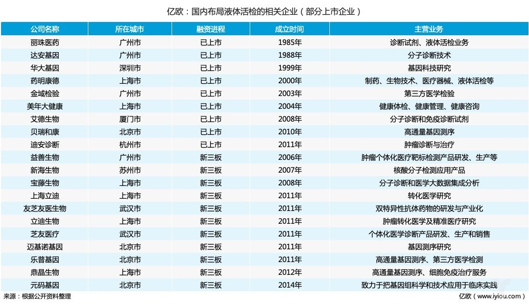 总体来说,目前国内涉足液体活检的公司主要有三种类型:一是基因检测公司,数量约为101家。此类公司在开展基因检测的基础上纷纷布局液体活检业务,既包括成立较早、相对“老牌”的公司,如华大基因、迪安诊断等,也包括成立相对较晚、将液体活检作为部分业务的公司,如贝瑞基因、泛生子、诺禾致源等。