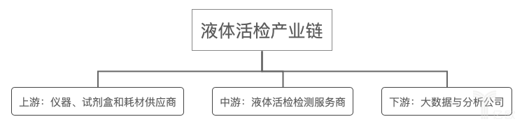 癌症液体活检作为基因测序产业下的一个细分领域,与基因测序有着非常相似的产业链模式。液体活检全产业链包括上游的仪器、试剂盒和耗材供应商,中游的液体活检检测服务商以及下游的大数据与分析公司。