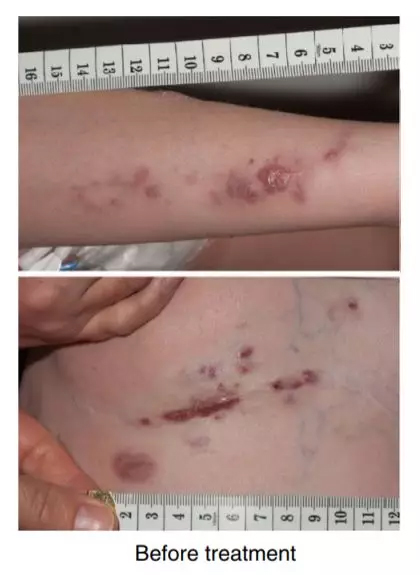 治疗前,伊莎贝尔的手术部位(下)出现了细菌感染。体内的细菌很快穿破皮肤,来到了其他部位(上)(图片来源: