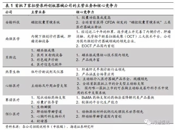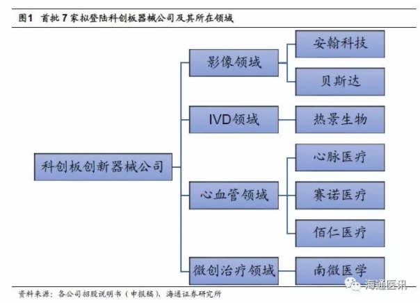 医疗器械是科创板重点发展的领域,此次我们选取了2019-4-15日及以前在科创板提交招股说明书(申报稿)的7家代表企业:安翰科技、贝斯达、赛诺医疗、南微医学、心脉医疗、热景生物、佰仁医疗(下边我们用“首批7家拟登陆科创板器械公司”“各公司”代指)。覆盖领域主要包括医学影像领域、体外诊断领域(IVD)、心血管领域和微创治疗领域,其中3家器械公司主营业务为心血管器械领域,数量最多。