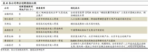 公司的创新属性是科创板重点考量的指标,提交科创板申报资料的器械公司大都具有较强的创新能力。贝斯达、南微医学、热景生物及心脉医疗均获得过国家级科学技术奖励。2014年国家食品药品监督局出台了《创新医疗器械特别审批程序(试行)》:针对创新医疗器械设置“绿色”审批通道,缩短审批时间,加速创新器械上市,佰仁医疗、南微医学及心脉医疗均有产品进入该“绿色通道”。