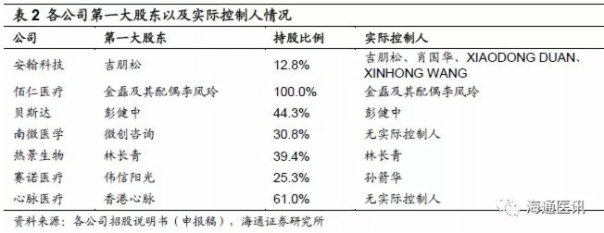 这些公司中,既有第一大股东持股比例高达100%的佰仁医疗,也有无实际控制人的南微医学、心脉医疗。我们认为跟传统医药公司不同,新生代的医药公司由于合伙创立、多轮融资等因素,部分公司原始股东的股权稀释较多,导致有些公司无实际控制人,这跟纳斯达克的医药公司股权架构有些相似。