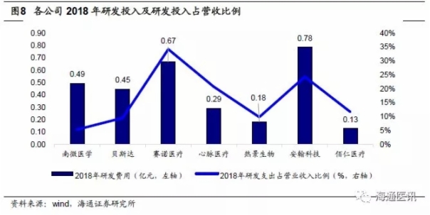 安翰科技2018年研发费用最高为0.78亿元,赛诺医疗、心脉医疗、安翰科技、佰仁医疗研发支出占收入比例超过10%,其中赛诺医疗研发支出占比高达34.17%。