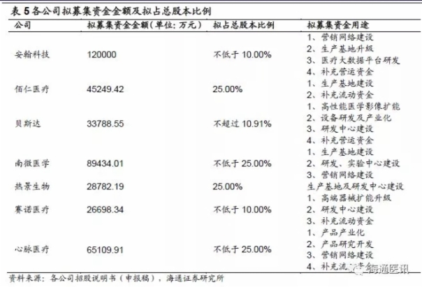 各公司拟募集资金及拟占总股本比例如下表所示,其中募集资金较多的有安翰科技(12亿元)、南微医学(8.94亿元)、心脉医疗(6.51亿元),拟募集资金用途包括扩大生产及研发等。