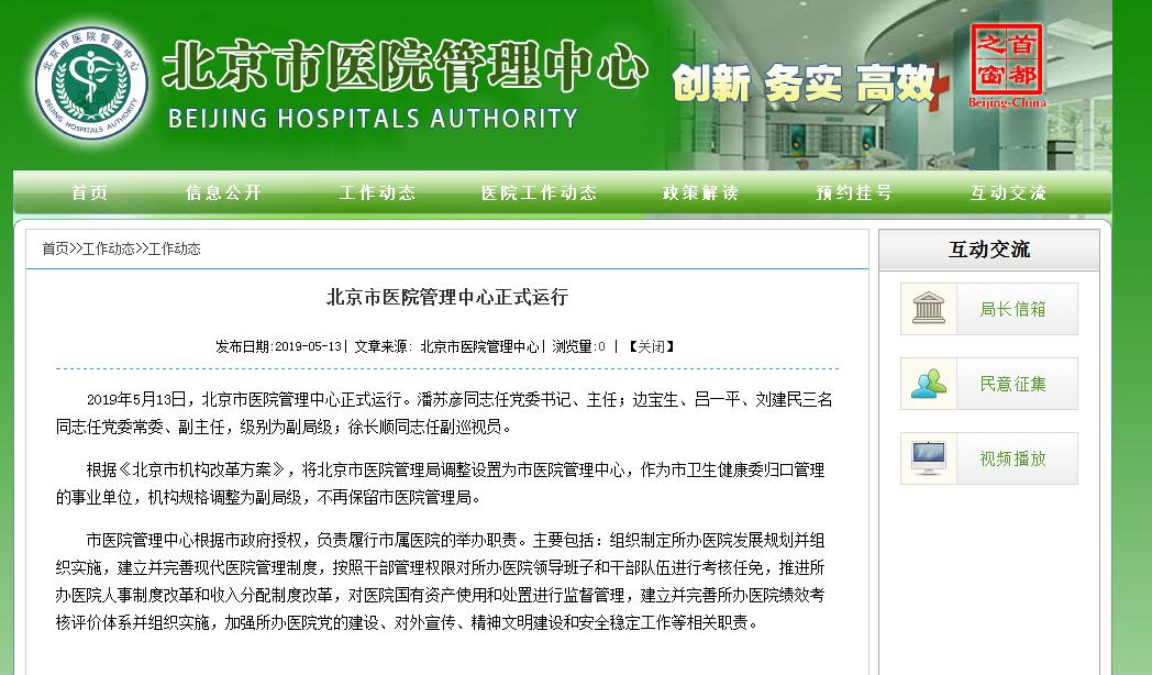 近日,北京市医院管理中心官网发布一则消息称,根据《北京市机构改革方案》,将北京市医院管理局调整设置为市医院管理中心,作为市卫生健康委归口管理的事业单位,机构规格调整为副局级,不再保留市医院管理局。