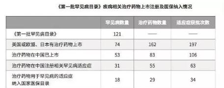 在中国,孤儿药市场才刚起步。目前,在国家《第一批罕见病目录》纳入的121种罕见病中,74种罕见病在全球有适应证的治疗产品上市销售。而在中国,上述74种罕见病中,9种在中国无药,22种在国内有药但存在超适应证使用情况,13种有治疗药品但未纳入医保,部分药品即使被纳入医保也面临准入障碍。