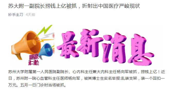 最先曝出该消息的是“妙手主刀”公号,该公号以“苏大附一副院长捞钱上亿被抓,折射出中国医疗严峻现状”为标题,曝出上述医生被抓的消息,随后,多家医疗垂直媒体也进行了跟踪报道。