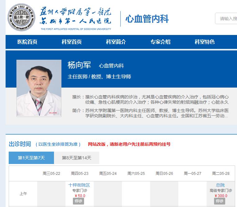 目前,杨向军在苏州大学附属第一人民医院官网上的出诊信息已经处于停诊状态。