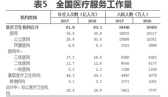 (一)门诊和住院量。2018年,全国医疗卫生机构总诊疗人次达83.1亿人次,比上年增加1.3亿人次(增长1.6%)。2018年居民到医疗卫生机构平均就诊6.0次。