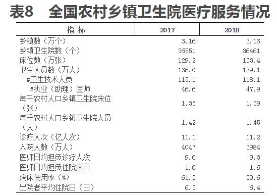 2018年,乡镇卫生院诊疗人次为11.2亿人次,比上年增加0.1亿人次;入院人数3984万人,比上年减少63万人。2018年,医师日均担负诊疗9.3人次和住院1.6床日。病床使用率59.6%,出院者平均住院日6.4日。与上年相比,乡镇卫生院医师工作负荷略有下降,病床使用率下降1.7个百分点,平均住院日比上年延长0.1日。