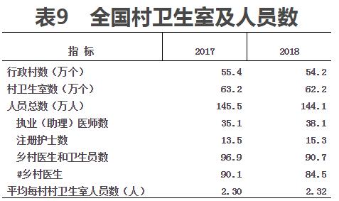 2018年底,全国54.2万个行政村共设62.2万个村卫生室。村卫生室人员达144.1万人,其中:执业(助理)医师38.1万人、注册护士15.3万人、乡村医生和卫生员90.7万人。平均每村村卫生室人员2.32人。与上年比较,村卫生室数减少1.0万个,人员总数有所减少(见表9)。