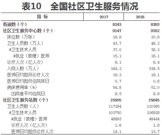 2018年,全国社区卫生服务中心诊疗人次6.4亿人次,入院人数339.5万人,诊疗人次比上年增加;平均每个中心年诊疗量6.8万人次,年入院量363人;医师日均担负诊疗16.1人次和住院0.6日。2018年,全国社区卫生服务站诊疗人次1.6亿人次,平均每站年诊疗量6244人次,医师日均担负诊疗13.7人次(见表10)。