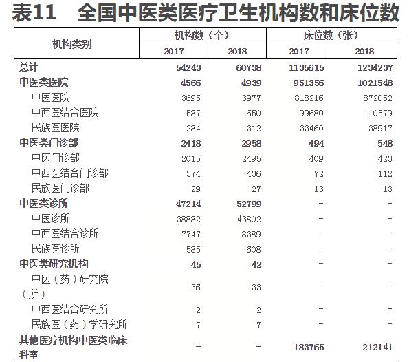 (一)中医类机构、床位及人员数。2018年末,全国中医类医疗卫生机构总数达60738个,比上年增加6495个。其中:中医类医院4939个,中医类门诊部、诊所55757个,中医类研究机构42个。与上年比较,中医类医院增加373个,中医类门诊部及诊所增加6125个(见表11)。