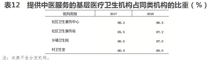 2018年末,提供中医服务的社区卫生服务中心占同类机构的98.5%,社区卫生服务站占87.2%,乡镇卫生院占97.0%,村卫生室占69.0%(见表12)。