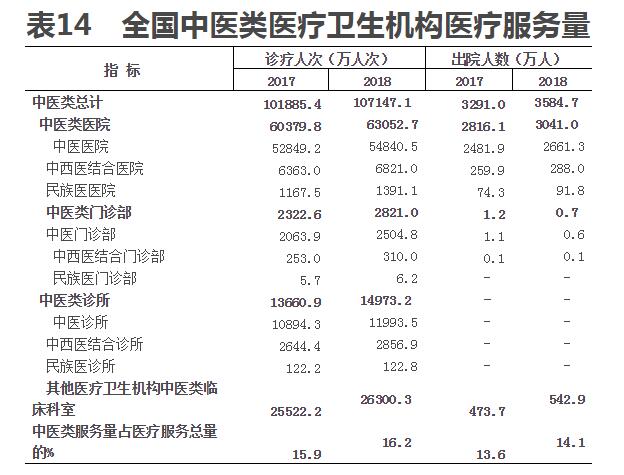 2018年,全国中医类医疗卫生机构出院人数3584.7万人,比上年增加293.7万人(增长8.9%)。其中:中医类医院3041万人(占84.8%),中医类门诊部0.7万人,其他医疗卫生机构中医类临床科室542.9万人(占15.1%)(见表14)。