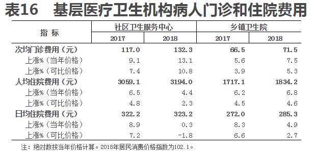 (二)基层医疗卫生机构病人医药费用。2018年,社区卫生服务中心次均门诊费用132.3元,按当年价格比上年上涨13.1%,按可比价格上涨10.8%;人均住院费用3194.0元,按当年价格比上年上涨4.4%,按可比价格上涨2.3%(见表16)。