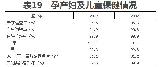 (一)妇幼保健。2018年,孕产妇产前检查率96.6%,产后访视率93.8%。与上年比较,产前检查率有所提高,产后访视率有所下降(见表19)。2018年住院分娩率为99.9%(市100.0%,县99.8%),与上年持平。
