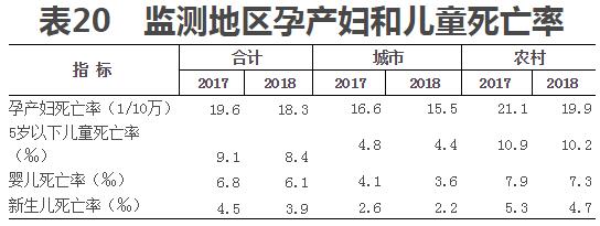 (三)孕产妇死亡率。据妇幼卫生监测,2018年,孕产妇死亡率为18.3/10万,其中:城市15.5/10万,农村19.9/10万。与上年相比,孕产妇死亡率有所下降(见表20)。 ?