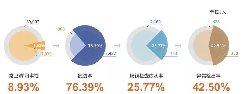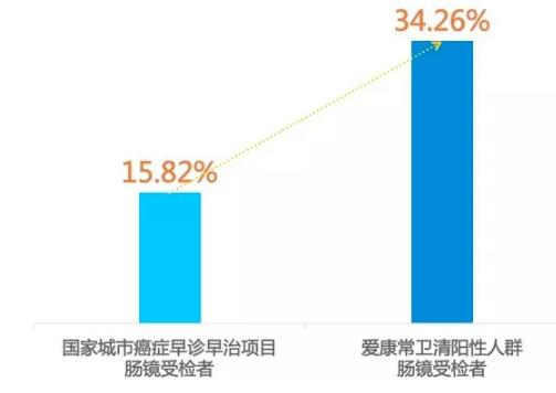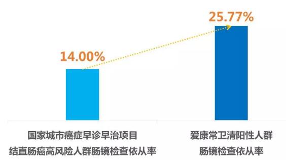 根据国家癌症中心在全国 16 个省份 22 个城市开展的城市癌症早诊早治项目数据显示:筛查出的结直肠癌高风险人群,其肠镜检查依从率仅为 14.00%。而在爱康通过常卫清?的检测及随访,阳性人群肠镜检查的依从率达到了25.77%。