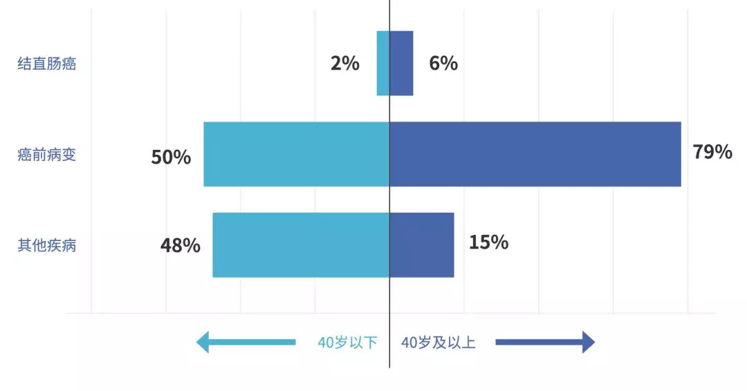 但年轻人也不可掉以轻心,近年来越来越多青年人习惯于不健康的生活方式,导致体重指数过高,糖尿病患病率也逐渐升高,这些因素可能是导致我国青年结直肠癌发病率逐渐增高的主要原因。40岁以下人群肠道病变除肠炎和溃疡外,主要为癌前病变(息肉或腺瘤),高达79.00%,早期肠道检测获益明显。40岁以上人群癌前病变、结直肠癌更为常见,推荐定期做结直肠癌筛查。