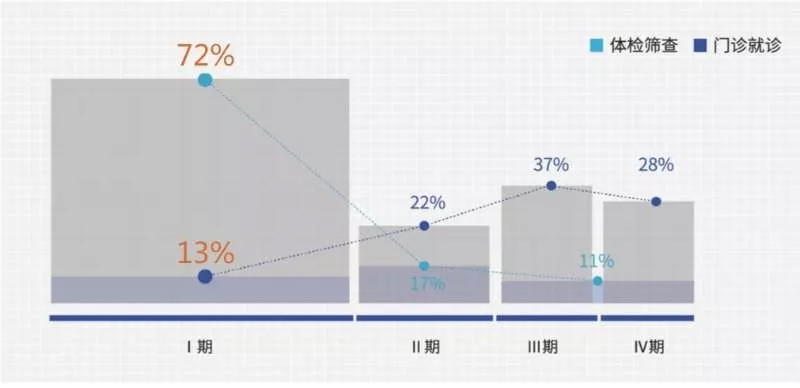 根据《中国预防医学杂志》发布的《北京市人群大肠癌筛查成本分析》数据显示,受检者通过体检筛查发现的结直肠癌中Ⅰ期占72%,而门诊就诊中发现结直肠癌中Ⅰ期只占13%,有28%的人在就诊时发现已经是晚期了。所以通过体检筛查,可以有效发现早期结直肠癌,从而实现肠道疾病的早发现、早诊断、早治疗。