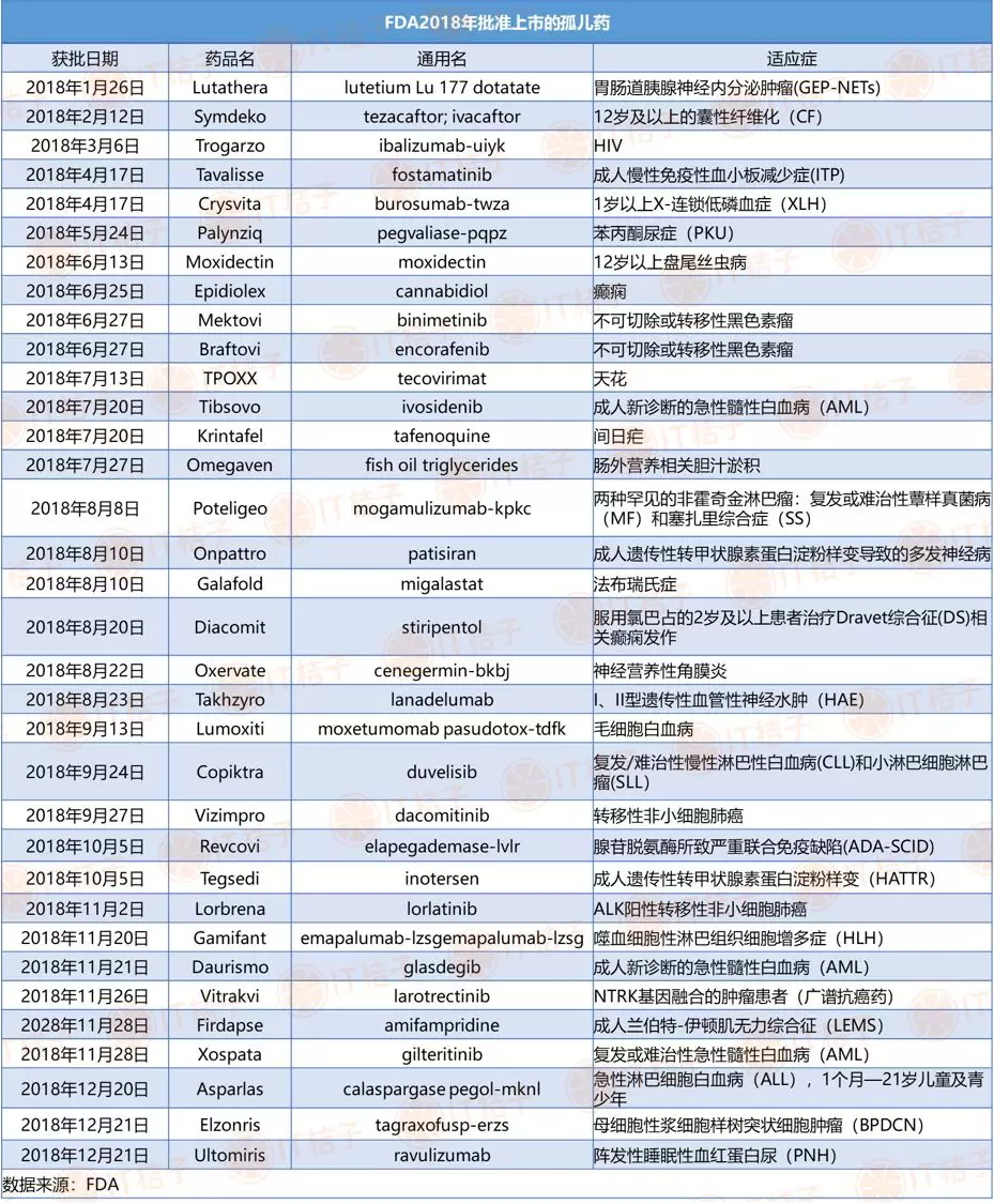 2018 年 FDA 批准上市的 59 个新药当中,仅孤儿药(又称为罕见药,指用于预防、治疗、诊断罕见病的药品)便占据了其中 34 个席位,占总数的 58%。