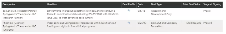 Spring Works Therapeutics 是从制药巨头 Pfizer 辉瑞分拆而出的一家公司,拥有 nirogacestat(PF-03084014)、MEK 1/2 抑制剂 PF-0325901、senicapoc(PF-05416266)和 FAAH 抑制剂 PF-04457844 款从辉瑞获得的已处于临床试验阶段的药物。