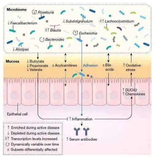 炎症性肠病情况下的宿主-微生物组动态变化示意图(图片来源:Nature)