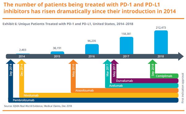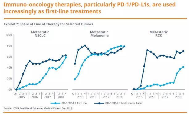 而且免疫检查点抑制剂如今越来越多地作为一线疗法使用。例如,截至2018年末,55%的初治转移性NSCLC患者使用一款获批PD-1/PD-L1抑制剂作为一线疗法。PD-1/PD-L1抑制剂也成为治疗转移性黑色素瘤患者的主要一线治疗选择。这些免疫检查点抑制剂从最初获批到成为一线疗法治只经过了2-3年的时间,显示出它们在疗效方面的显著优势。