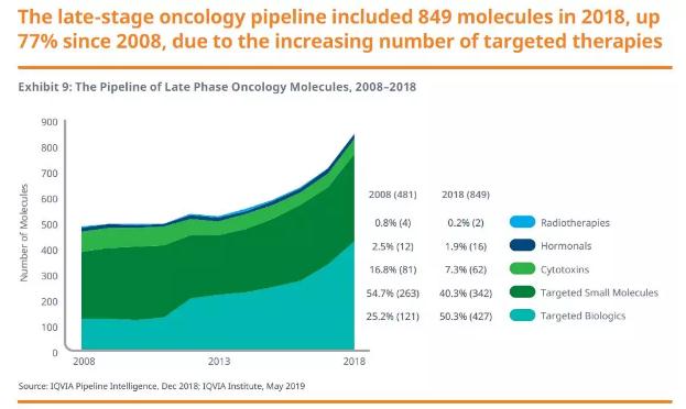 肿瘤学后期研发管线在2018年包括849种分子,与2008年相比增长77%,与2017年相比增长19%,这是由于研发管线中靶向疗法的大幅度增长。在2018年的后期研发管线中,91%的疗法是靶向小分子或者生物制剂疗法。靶向生物制剂比2017年增长了30%,而靶向小分子疗法增长了14%。