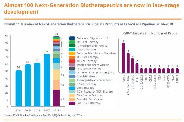 在2018年的后期研发管线中,包含基因疗法、细胞疗法和核苷酸疗法在内的下一代生物疗法Next Generation Biotherapeutic, NGB)接近100种,与2013年相比接近翻倍,比2017年也增长了32%。