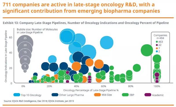 在这些公司中,494家公司的全部后期研发管线是肿瘤学产品。这种类型的公司包括463家EBP公司,22家学术研究机构,7家中型公司和2家大型药企。这些数据表明,EBP在肿瘤学创新疗法的研发中起到重要作用。